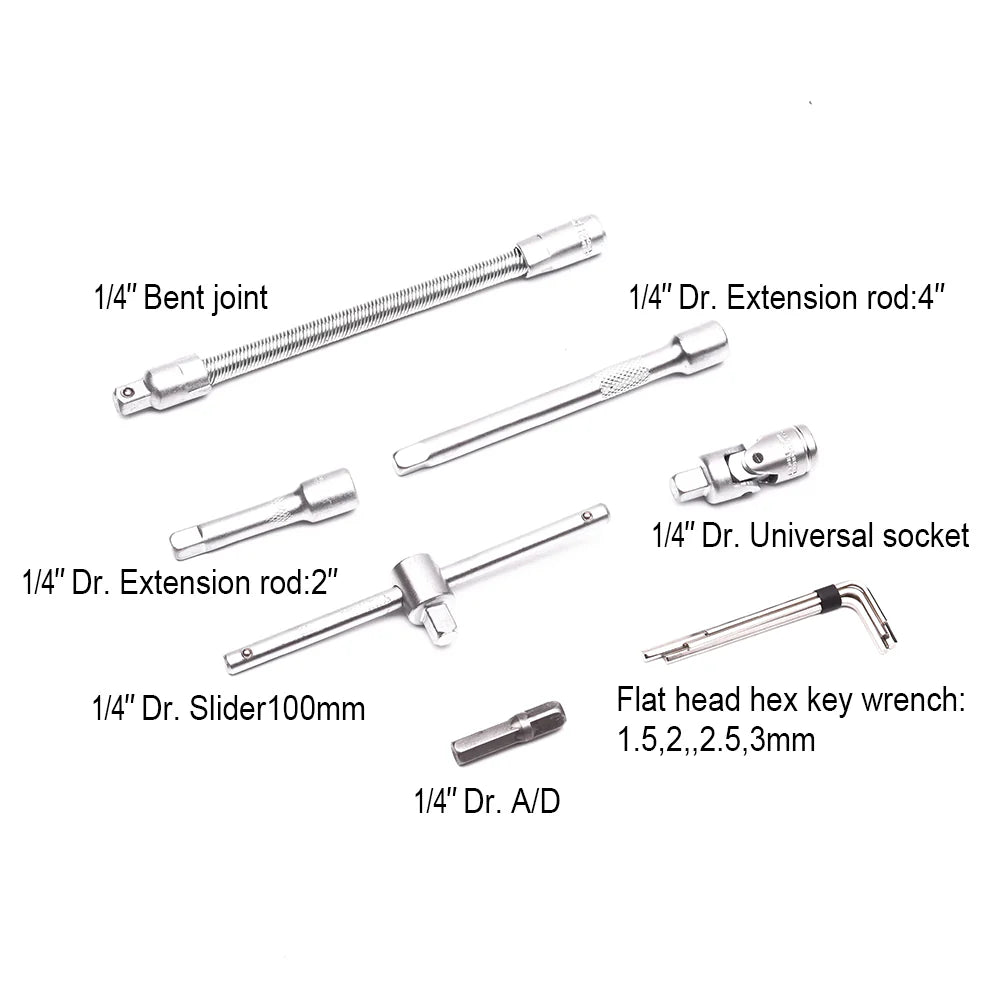 The Harden 46 Pcs 1/4" Drive Socket and Bit Set is a versatile and complete tool kit for automotive, electrical, and general mechanical work. All pieces are made from durable Forged Chrome Vanadium steel.